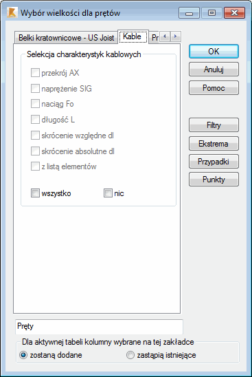 - Skrócenie absolutne dl — jeżeli ta opcja zostanie wybrana, to w tabeli pojawi się kolumna, w której przedstawiana będzie wartość dylatacji. Skrócenie jest to różnica długości cięgna w stanie nieobciążonym i odległości węzłów, pomiędzy którymi cięgno jest zamocowane.