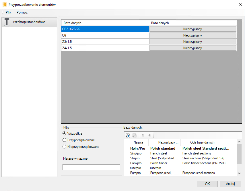 - Po kliknięciu przycisku OK nierozpoznanym przekrojom zostaną nadane przekroje z bazy (przypisane zostaną im właściwości geometryczne).