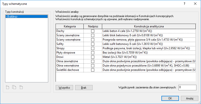 Można wybrać kategorie elementów, dla których mają być stosowane typy schematyczne. Kategorie elementów, które nie zostały nadpisane przez typy schematyczne, będą nadal używać domyślnych typów koncepcyjnych. Jeśli opcja Elementy szczegółowe jest włączona, to typy schematyczne i typy koncepcyjne są nadpisywane przez zdefiniowane właściwości cieplne oparte na materiałach.