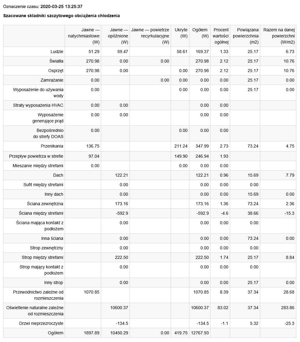 Na przykład podsumowanie obciążeń składowych strefy zawiera informacje na temat wymiarowania obciążeń ogrzewania i chłodzenia dla każdej przestrzeni analitycznej. Przykład szczytowego obciążenia chłodzenia przestrzeni przedstawiono poniżej. W tym przykładzie całkowite obciążenie wynosi 12 768 W.