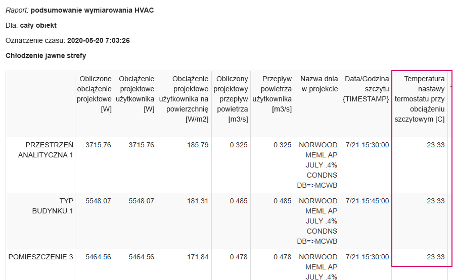 Te nastawy są używane podczas przeprowadzania analizy systemów. Po przeprowadzeniu analizy wymiarowania nastawy chłodzenia i ogrzewania są wyświetlane w raporcie analizy w podsumowaniu wymiarowania HVAC.