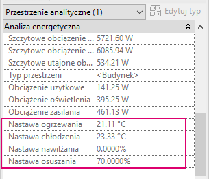 Po utworzeniu modelu energetycznego nastawy w ustawieniach typu budynku są stosowane do przestrzeni analitycznych i wyświetlane na palecie Właściwości jako tylko do odczytu.