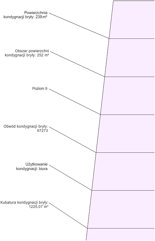 Po utworzeniu zakresów kondygnacji można je oznaczyć w widokach 2D. Oznaczenia mogą zawierać informacje na temat powierzchni, powierzchni zewnętrznej, obwodu, objętości i typu użytkowego dla każdego zakresu kondygnacji.