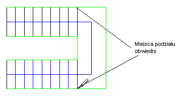 Jeśli schody tworzone poprzez szkicowanie linii obwiedni i podstopnic zawierają spocznik, należy podzielić linie obwiedni w miejscach styku ze spocznikiem tak, aby położenie poręczy odzwierciedlało spocznik i pochylenie schodów.