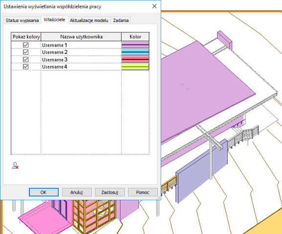Ustawienia wyświetlania współdzielenia pracy. Określony kolor dla odpowiedniego właściciela zostanie wyświetlony w modelu.