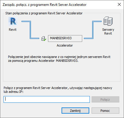 Za pomocą tej procedury można sprawdzić stan połączenia z programem Accelerator, który został przypisany do danego położenia (określonego w systemowej zmiennej środowiskowej RSACCELERATOR2022) i, w razie konieczności, wybrać inny program Accelerator. Jeżeli połączenie sieciowe z programem Revit Server Accelerator zostanie utracone lub użytkownik zdecydował o niekorzystaniu z tego programu, zostanie on bezpośrednio połączony z serwerami Revit Server.