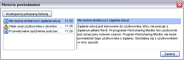 W okienku Powiadomienia narzędzia Worksharing Monitor znajdują się tylko aktywne powiadomienia, czyli problemy nierozwiązane. Jeśli problem został rozwiązany, powiadomienie o problemie jest przenoszone do historii powiadomień.