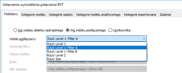 - W oknie dialogowym Ustawienia wyświetlenia połączenia RVT, na karcie Podstawy wykonaj następujące czynności: