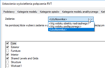 Dla modelu nadrzędnego użyj karty Zadania w oknie dialogowym Ustawienia wyświetlenia połączenia RVT. Na tej karcie można wybrać określone zadania, które mają zostać wyświetlone w widoku modelu nadrzędnego.