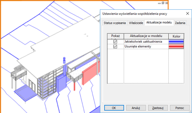 Ustawienia wyświetlania współdzielenia pracy. Kolory określone dla odpowiednich aktualizacji lub usuniętych elementów zostaną pokazane w modelu.