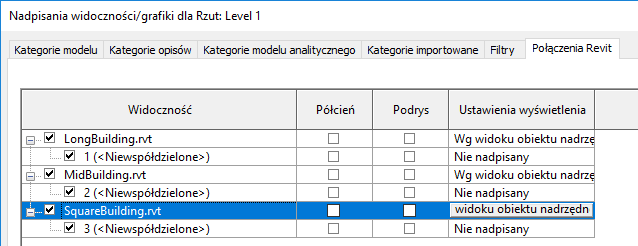 Parametry sterujące widocznością i grafiką podłączonych modeli programu Revit są zgrupowane na specjalnej karcie Połączenia Revit w oknie dialogowym Widoczność/Grafika.