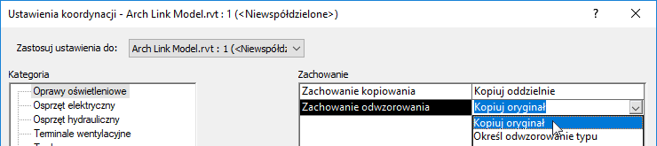 Przed skopiowaniem osprzętu z podłączonego modelu do projektu MEP lub w trakcie tego procesu określ zachowanie mapowania do każdej kategorii osprzętu w oknie dialogowym Określ ustawienia koordynacji.