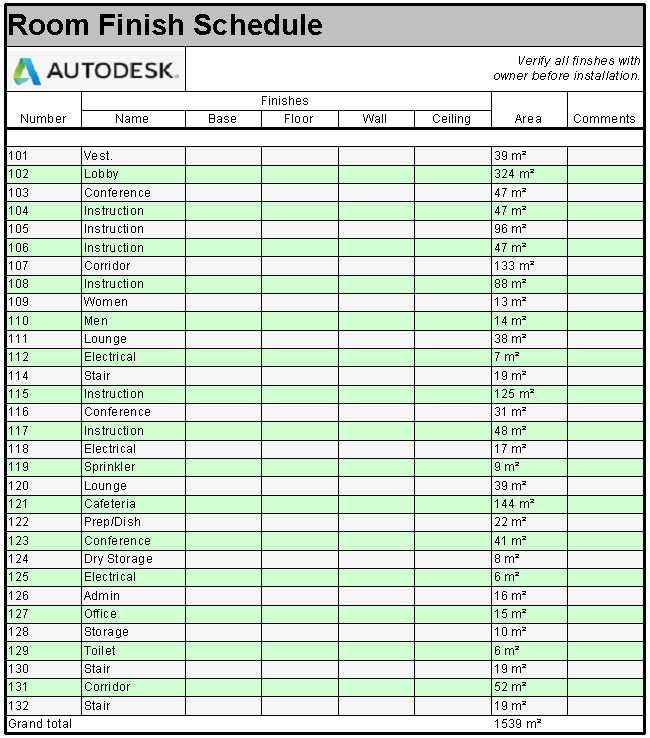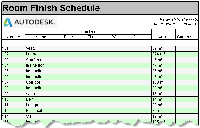 Korzystaj z narzędzi formatowania, aby jak najlepiej przekazać informacje w zestawieniu. Jeśli w widokach zestawień ma być używany standard biurowy, formatowanie zestawienia umożliwia dostosowanie domyślnego sposobu prezentacji zestawienia w programie Revit. Konfiguruj zestawienia i zmieniaj formatowanie nagłówków w plikach szablonów modeli. Po dodaniu elementów do modelu zestawienie jest sformatowane i gotowe do umieszczenia na arkuszach.