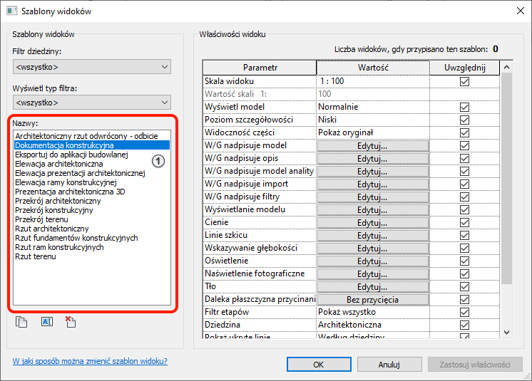 Szablony widoków sterują wieloma aspektami wyglądu widoku. Także inne aspekty, takie jak skala, cienie lub stan etapu, mogą być uwzględnione jako część szablonu widoku. Wszystkie właściwości widoku sterowane za pomocą szablonu widoku są wyświetlane po prawej stronie okna dialogowego właściwości widoku. Podczas tworzenia szablonów widoków należy sprawdzić wszystkie aspekty widoku, które są kontrolowane, aby można było jak najlepiej wykorzystać szablony widoku.