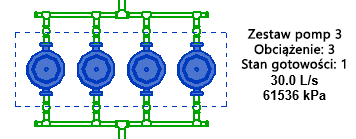 Podczas tworzenia zestawu elementów mechanicznych można określić liczbę aktywnych i nieaktywnych pomp. Te informacje służą do obliczania przepływu spadku ciśnienia w celu właściwego dobrania rozmiarów odgałęzień i kolektora zestawu pomp.