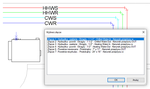 Jeśli nowy komponent może być połączony z więcej niż jednym systemem, zostanie otwarte okno dialogowe Wybierz złącze. Każde złącze rurowe jest wyświetlane z numerem indeksu, klasyfikacją systemu, kształtem, rozmiarem, opisem złącza i kierunkiem przepływu. W opisie złącza może być podany typ systemu, który powinien być przypisany do złącza. Strzałka wskazuje położenie i kierunek wybranego złącza.