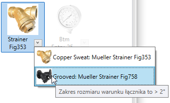 Kliknięcie strzałki powoduje wyświetlenie listy rozwijanej z dodatkowymi częściami w zależności od rozmiaru. Ta lista rozwijana jest zależna od warunków określonych w definicji usługi, podobne jak w przypadku preferencji przebiegu. Na przykład gięcie może użyć naciśniętego przycisku Gięcie w górę do określonego rozmiaru i Złożone gięcie powyżej tego rozmiaru. Po umieszczeniu kursora nad częścią na liście etykieta narzędzia wyświetla zakres wielkości w oparciu o warunek dla tej części.