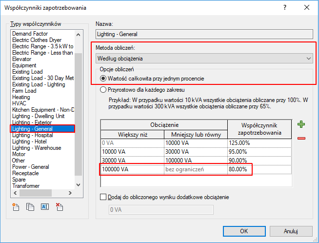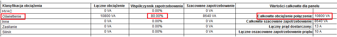 Współczynnik zapotrzebowania na oświetlenie został określony jako obliczony przez obciążenie z całkowitym obliczeniem przy jednym procencie. Jeśli obciążenie jest większe niż 10000 VA, współczynnik zapotrzebowania wynosi 80%.