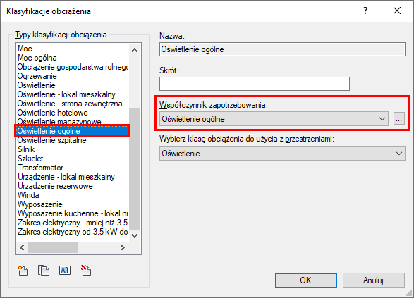 Współczynnik zapotrzebowania na oświetlenie został przypisany do odpowiedniego typu klasyfikacji obciążenia oświetleniem.