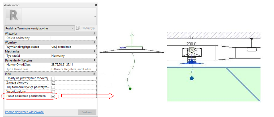 edytować rodzinę urządzeń nawiewnych, aby włączyć punkt obliczania pomieszczenia, a następnie przesunąć położenie punktu obliczania, tak aby znajdował się wewnątrz przestrzeni. W Edytorze rodzin, na palecie Właściwości, włącz punkt obliczania pomieszczenia. Edycja położenia punktu obliczania pomieszczenia, tak aby znajdował się wewnątrz przestrzeni.