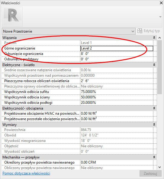 (Obliczenia kubatury i powierzchni) jest wybrana (ustawienie domyślne). Zobacz temat Informacje o obliczeniach kubatury. Jeśli tworzysz przekrój, upewnij się, że linia przekroju przecina przestrzeń w rzucie kondygnacji, dzięki czemu można wyświetlić ją w widoku przekroju.