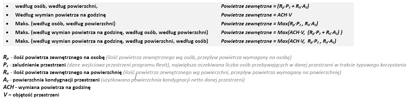 | Metoda powietrza zewnętrznego | Jeśli wybrano przestrzeń, ta właściwość wyświetla metodę obliczania zapotrzebowania na powietrze zewnętrzne w przestrzeni. Okno dialogowe Ustawienia typu budynku/przestrzeni umożliwia wybranie jednej z poniższych metod obliczania: