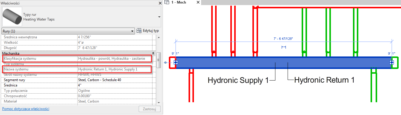 Jeśli pętle drugiego rzędu są połączone z nagłówkiem za pomocą połączeń przyłączy, nagłówek będzie zawierać zarówno system zasilania, jak i system zwrotu pętli głównej. Systemy te będą podzielone w środku rury, jak wskazano to za pomocą etykiet na ilustracji poniżej. Uwaga: zarówno nazwy systemów, jak i klasyfikacje systemów są wyświetlane na palecie Właściwości.