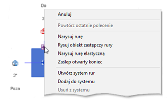 Dodawanie z menu kontekstowego: umieść wskaźnik myszy na złączu rury na rodzinie osprzętu lub sprzętu i kliknij prawym przyciskiem myszy, aby wyświetlić menu kontekstowe. Kliknij opcję Rysuj rurę, aby dodać rurę oraz odziedziczyć rozmiar i rzędną ze złącza. Ta rura będzie mieć typ systemu przypisany do tej samej klasyfikacji systemu co złącze. Tej metody można też używać w widoku elewacji lub przekroju.