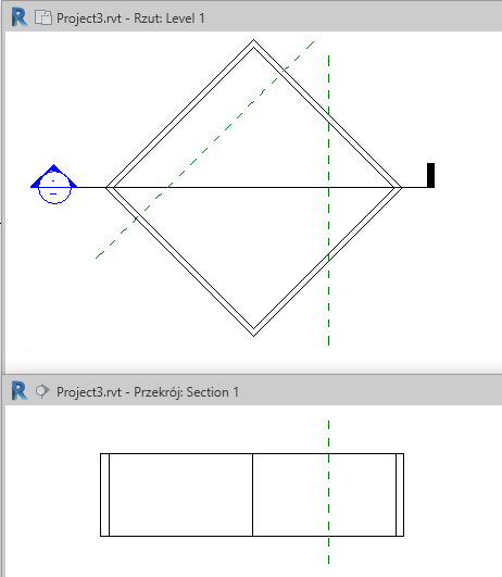 Na przykład w następującym rzucie znajdują się dwie płaszczyzny odniesienia wskazane zielonymi liniami przerywanymi. Płaszczyzna odniesienia po lewej przecina linię przekroju pod pewnym kątem. Płaszczyzna odniesienia po prawej jest prostopadła do linii przekroju. Ponieważ znajdująca się pod pewnym kątem płaszczyzna odniesienia nie jest prostopadła do linii przekroju, płaszczyzna nie zostanie wyświetlona w wynikowym przekroju. Jednakże prostopadła płaszczyzna odniesienia zostanie wyświetlona w przekroju.
