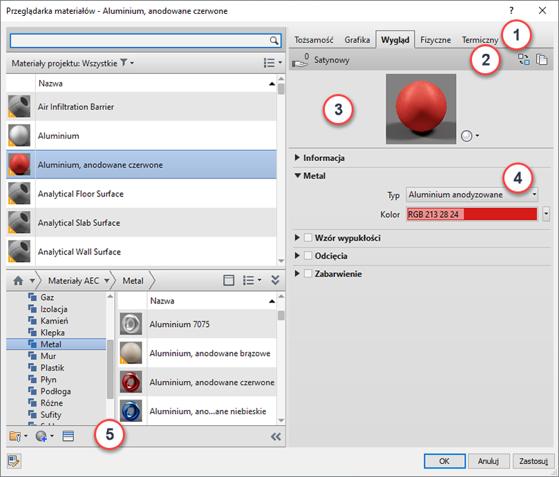 4 Panel Właściwości: Pozwala wyświetlać szczegółowe właściwości wybranego zasobu i zarządzać nimi. Nazwa i opis zasobu są wyświetlane poniżej panelu rozwijanego Informacje. W przykładzie powyżej przedstawiono (rozwinięto) właściwości metalu dotyczące wyglądu zasobu „Anodyzowane — czerwone”. Na przykład zestaw właściwości, które są wyświetlane dla cieczy, różni się od zestawu właściwości wyświetlanego dla konstrukcji blachowych.