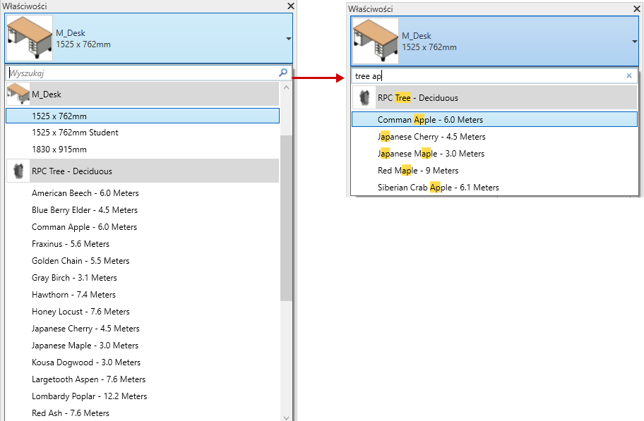 Revit LT udostępniono funkcję wyszukiwania, aby ułatwić wybór z długiej listy opcji. Można wyszukiwać w następujących obszarach funkcyjnych: