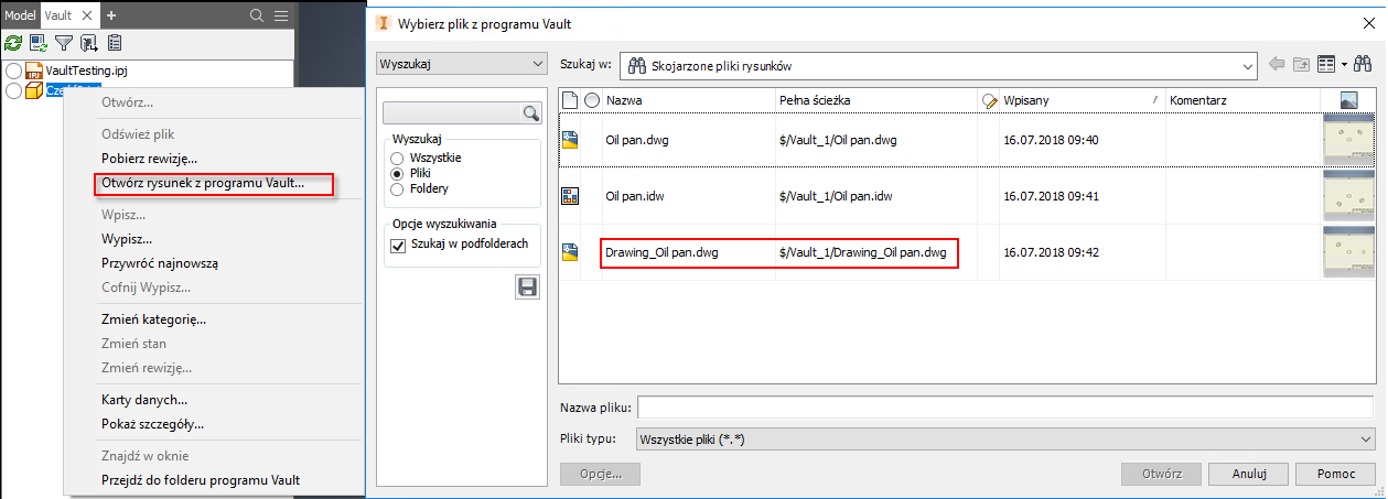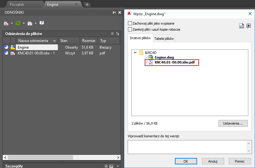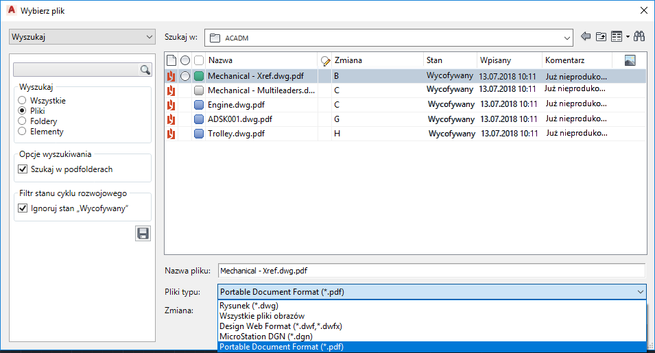 Program Vault obecnie obsługuje rysunki programu AutoCAD z załącznikami w formacie PDF.