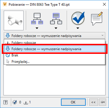 Dzięki prostemu ustawieniu można obecnie określić, że ma być pobierana najnowsza wersja pliku. Oznacza to, że nawet jeśli na komputerze lokalnym istnieje wersja pliku nowsza niż wersja pliku w repozytorium, to domyślnie jest otwierana najnowsza wersja. Wybranie opcji „Foldery robocze — wymuszenie nadpisywania” w oknie dialogowym Pobierz powoduje, że pozostaje ona zaznaczona, dopóki ustawienie nie zostanie zmienione, co gwarantuje, że zawsze pobierana jest najnowsza wersja pliku.