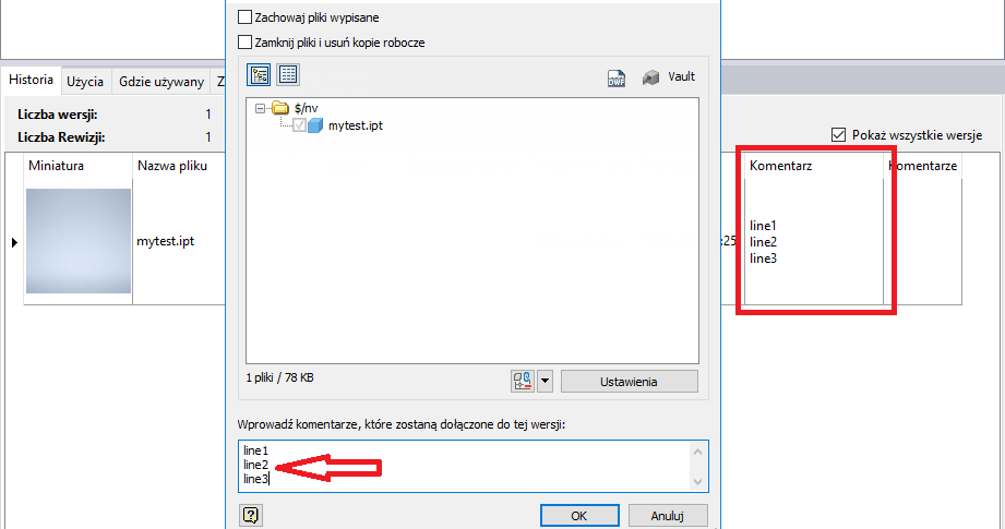 Dotychczas, jeśli komentarz wielowierszowy był dodawany w oknach dialogowych, takich jak Wpisz lub Zmień stan, był wyświetlany jako pojedynczy wiersz w programie Vault Client. „Komentarze” były wyświetlane jako pojedynczy wiersz w programie Vault Client. Dzięki tej aktualizacji komentarze wielowierszowe również są odzwierciedlane w programie Vault Client.