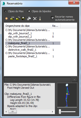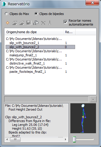 Se você clicar em um clipe na lista, a janela abaixo da lista exibirá informações sobre o clipe, incluindo as diferenças entre a figura às quais elas são aplicadas e a figura a partir da qual o arquivo foi salvo originalmente. Uma segunda janela exibe uma vista gráfica da animação do bípede. Arraste o controle deslizante abaixo da janela para mover a animação.