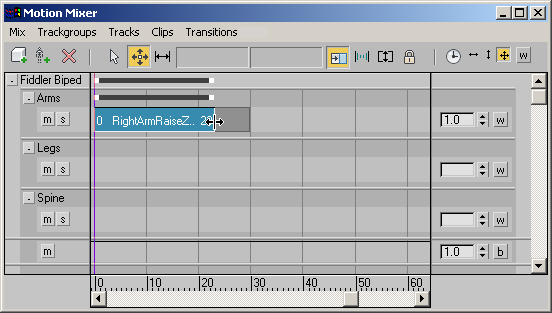 Você pode aumentar ou reduzir a velocidade de um movimento alterando o comprimento do clipe no Mixer. Esticar um clipe retarda o movimento, enquanto seu encurtamento o acelera.