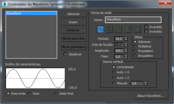 - Adiciona uma nova forma de onda ao final da lista. O valor padrão é uma onda senoide com um período de 10 quadros e com uma amplitude de 100.