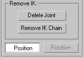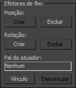 Com as opções deste grupo, você pode adicionar ou excluir os efetores de fim de Posição ou Rotação de qualquer união. As opções afetam somente a união selecionada atualmente. Um end effector é o objeto que a cadeia IK segue para chegar a uma solução. Há dois tipos de end effectors: Position and Rotation. Ambos são exibidos na união como três linhas azuis que se encontram. Quando você seleciona uma união que possui um ou ambos efetores de fim e realiza uma transformação que coincide com o tipo de efeitor de fim, somente o end effector será transformado. Os objetos na cadeia, a seguir, utilizam IK para seguir e criar a solução IK.