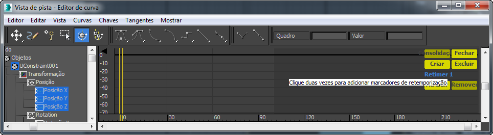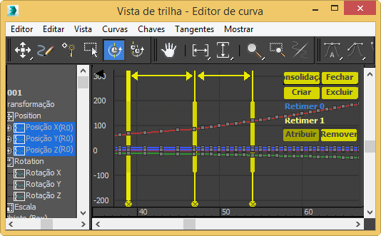 Para usar a ferramenta Retime, abra Track View no modo Curve Editor e selecione as tracks nas quais deseja realizar a variação de tempo. A seguir, após ativar a ferramenta, clique duas vezes na janela Editor de Curva em Track View para posicionar os marcadores do retime. Cada par de marcadores verticais adjacentes incluem o tempo entre eles nas tracks selecionadas. Em seguida, mova os marcadores para alterar o tempo da animação. Se você aproximá-los, a animação acelera; se distanciá-los, a animação desacelera.