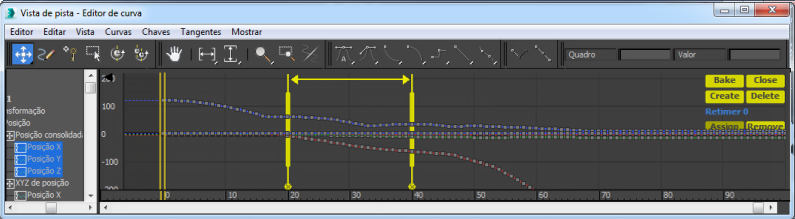 Isto remove a animação da track destacada da influência do retimer. O retimer permanece, mas não poderá afetar o movimento do objeto. A curva do objeto desaparece da janela Tecla para indicar que a animação não mais está sujeita à edição com este retimer.