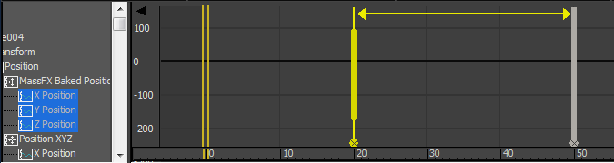 Track View se abre no modo Curve Editor. Somente tracks animadas do objeto selecionado são realçados na janela Hierarquia em Track View - Curve Editor. Este é o comportamento padrão.