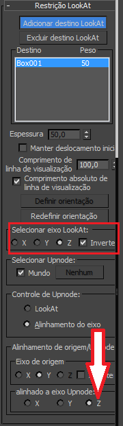Use para definir o eixo que olha para o alvo. As caixas de seleção X, Y, Z refletem o sistema de coordenadas local do objeto restringido. A caixa Inverter inverte as direções dos eixos locais.