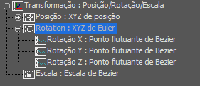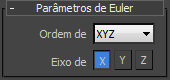 O controlador Rotação de Euler XYZ é um controlador composto que combina controles de fluxo de valor único, separados para especificar um ângulo de rotação sobre cada um dos eixos X, Y e Z. O Euler XYZ não é tão suave quanto à rotação de quatérnion (utilizado pelo controlador Rotação de TCB), mas é o único tipo de rotação que você pode usar para editar as curvas de função de rotação.