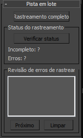 A implementação Trilha em lote do Camera Track Utility executa rastreamento de transferências do recurso depois que os rastreadores são configurados. É possível configurar um conjunto de rastreadores, iniciar um rastreamento de lote de todos eles e então utilizar outras ferramentas deste painel para verificar e revisar erros de rastreamento detectados. Este painel também verifica a conclusão do rastreamento.