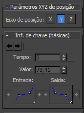 Os seguintes parâmetros estão disponíveis com o controlador Posição de Bezier. O controlador de posição padrão, Posição XYZ, mostra somente um eixo de cada vez e o controlador de Posição TCB mostra, além das posições dos eixos X, Y e Z, os controles para Atenuar de/para, Tensão, Continuidade e Desvio. Os outros controladores diferem, conforme o necessário.