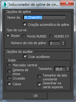 Esta caixa de diálogo permite definir os parâmetros do spline que será criado para controlar a estrutura de ossos. A spline, por sua vez, é modelada pelas posições dos objetos de ajuda em cada nó(ponto de controle).