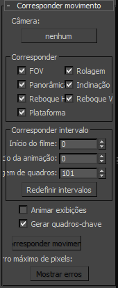 - Controla se o viewport do 3ds Max é exibido e se a janela Filme é atualizado quadro a quadro para mostrar os resultados da correspondência. Esta atualização da exibição pode ser muito demorada, portanto, às vezes é melhor deixá-la desativada e analisar os resultados da correspondência observando as curvas da função Câmera no Rastreador de câmera ou passando a animação do 3ds Max um quadro de cada vez após a correspondência.