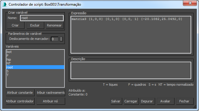 3ds Max interpreta o texto inserido na caixa de texto Script como corpo de uma expressão do bloco do MaxScript. É possível inserir tantas expressões quanto você deseja em tantas linhas quanto você deseja, e eles são avaliadas de volta. O valor da última expressão é utilizado como o valor do controlador. Este valor deve compor o tipo correto para o controlador: flutuar para Fluturar Point3 para Posição, quaternária para Rotação, matrix3 para Transformar, e assim por diante.