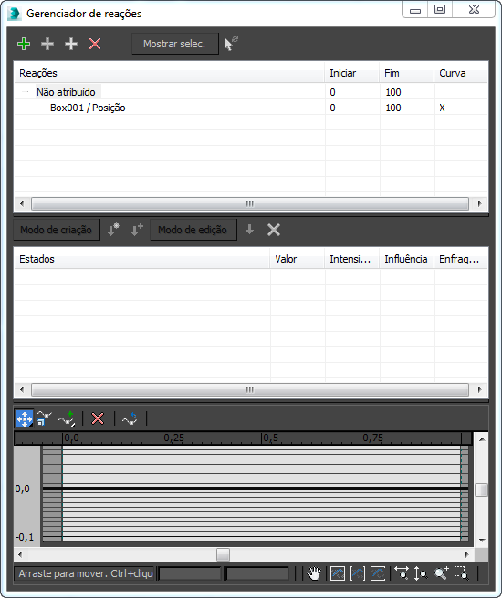 A diferença entre criar um estado na opção Criar modo ou fora dela é que, em Criar modo, é possível manipular as trilhas de reação para todos os objetos; com essa opção desativada, só é possível manipular a trilha de reação para o driver de reação.