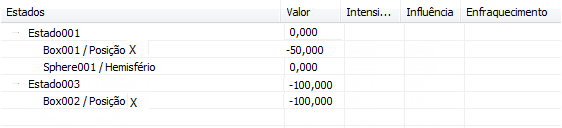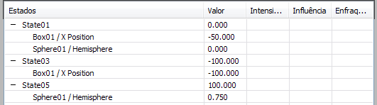 Um estado descreve a interação entre um driver de reação e suas entradas orientadas. Em cada estado, especifique um valor ou conjunto de valores para a trilha do driver de reação e os valores correspondentes para cada entrada orientada. Em seguida, quando um valor de trilha orientada mudar na cena, os valores orientados acompanharão, segundo as especificações de estados.